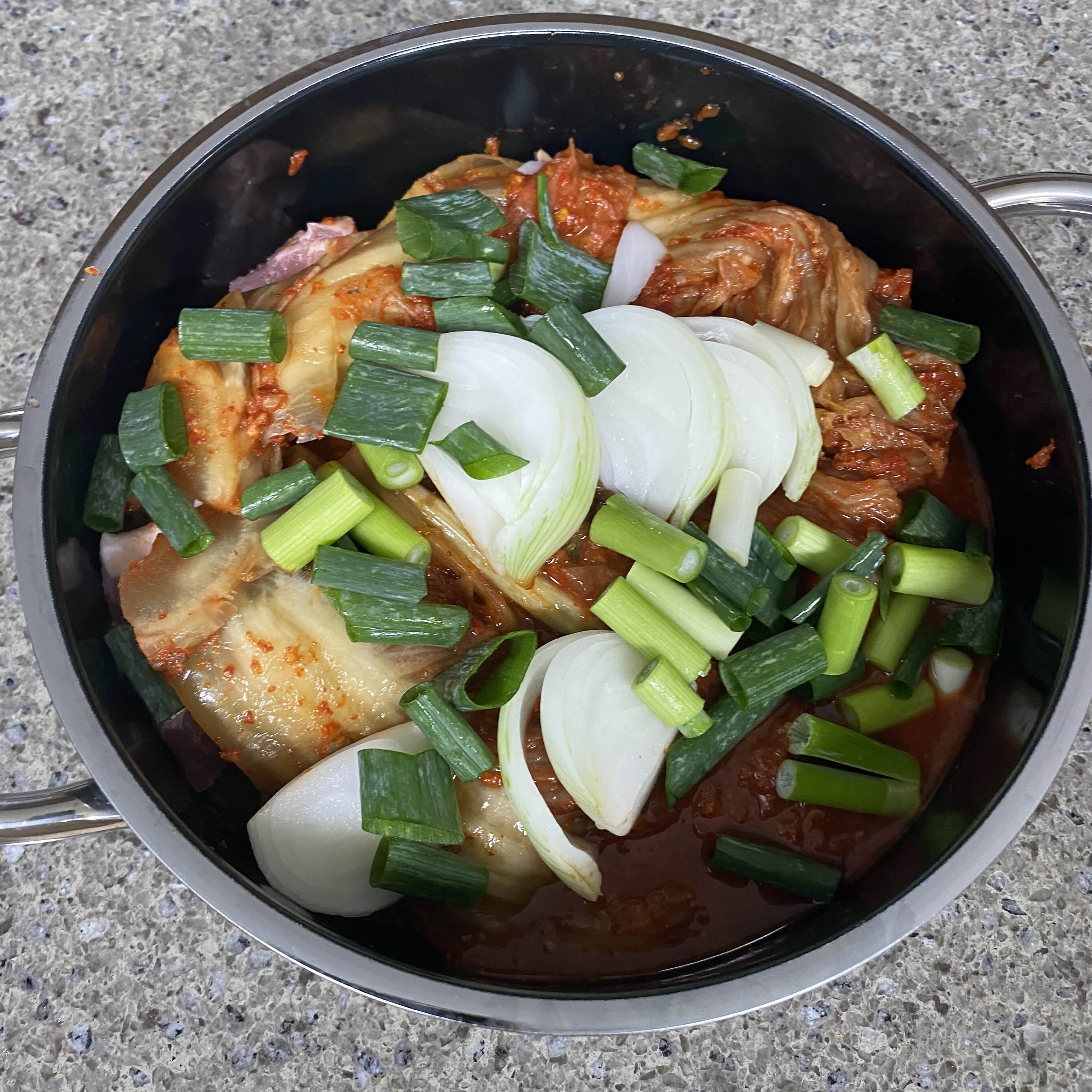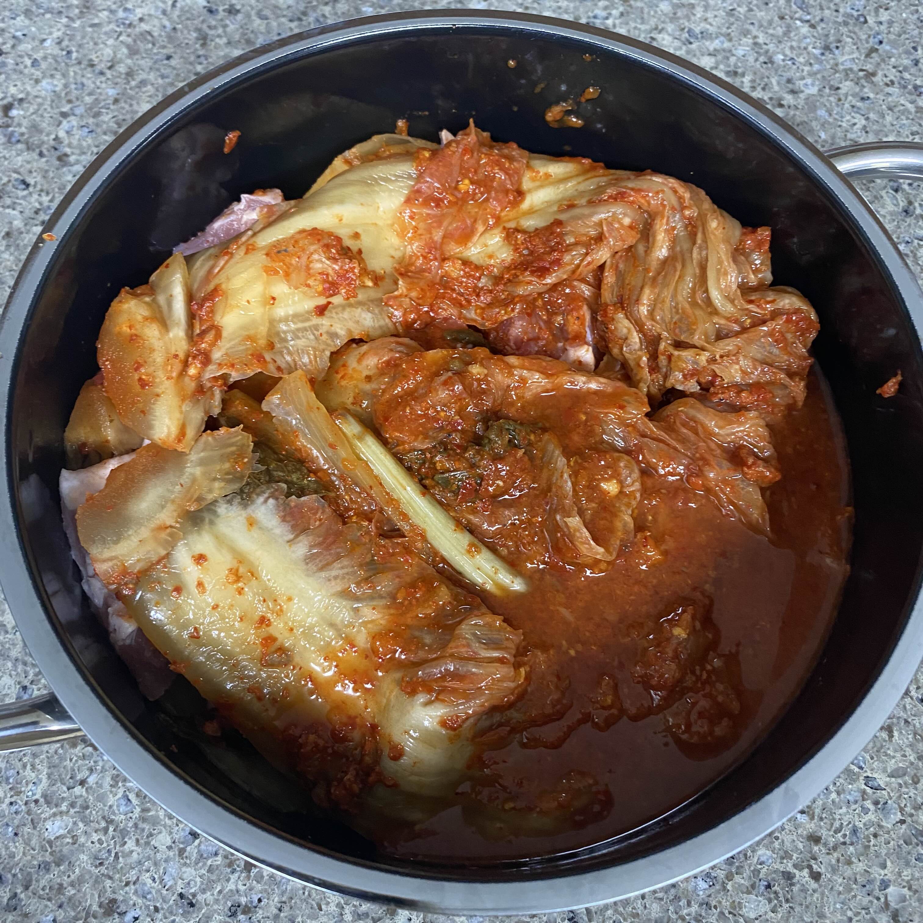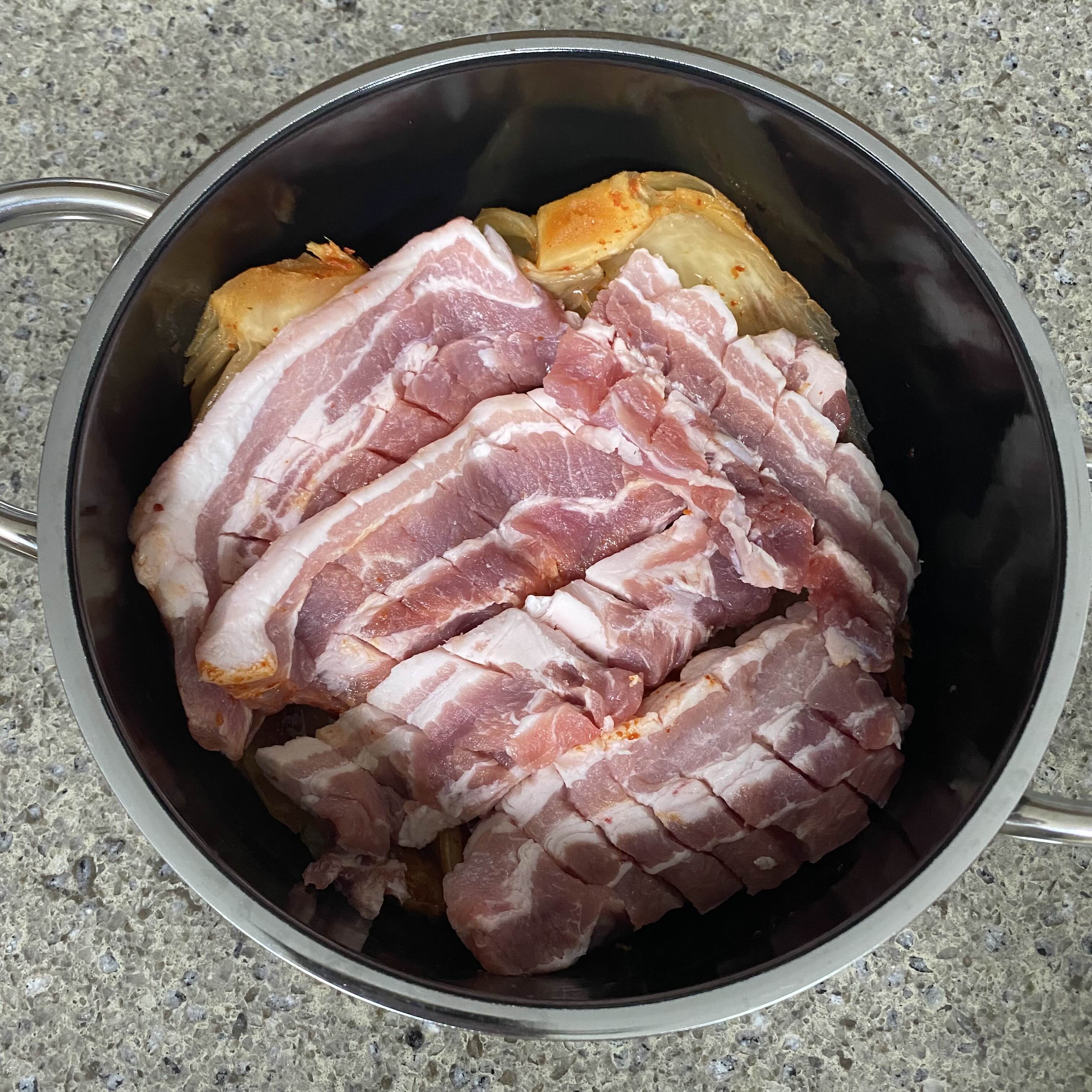 4. 냄비에 김치를 깔고 고기를 올린 후 다시 김치로 덮어준다.