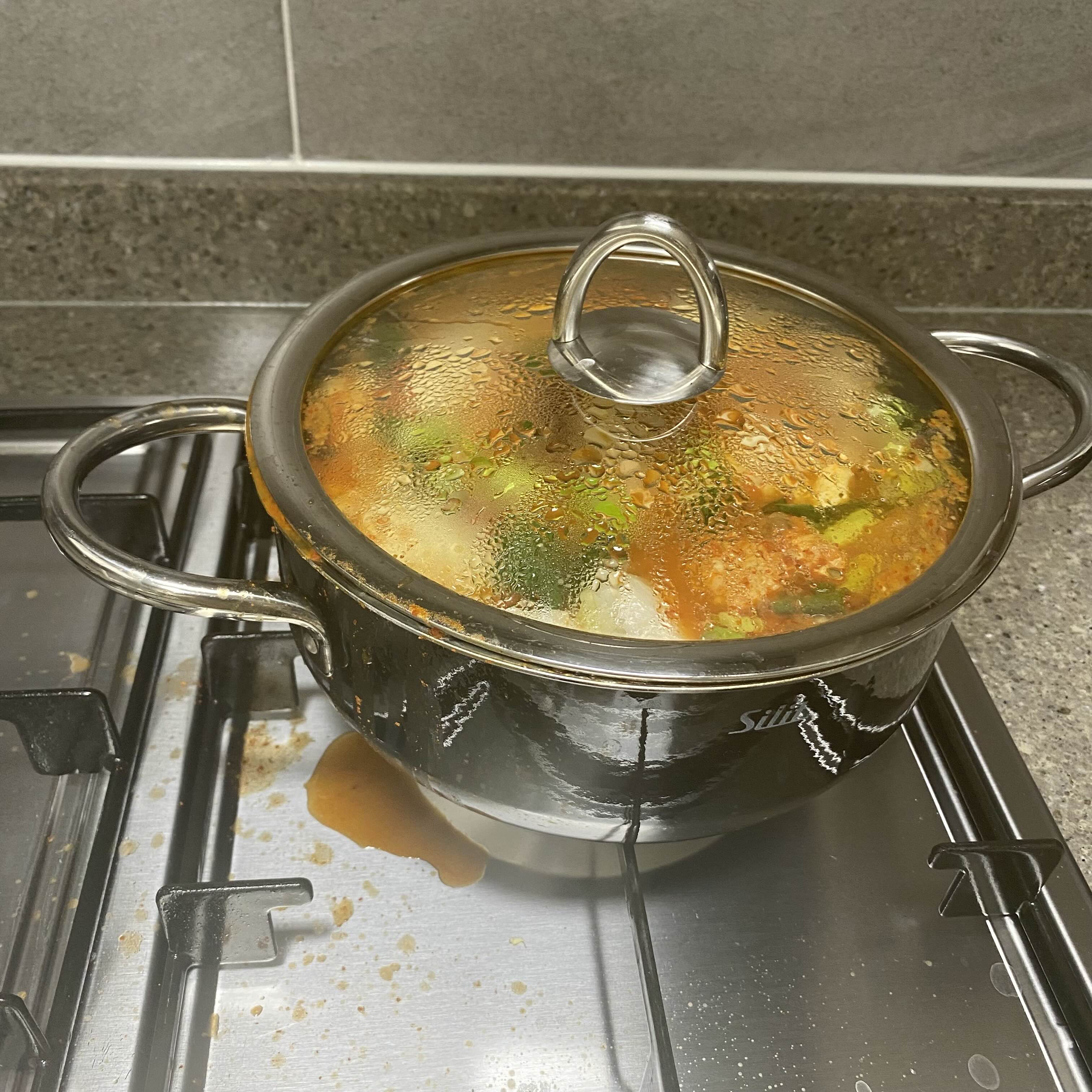 7. 센 불로 켜고 끓으면 중 약불로 줄여 뚜껑 덮고 졸인다.