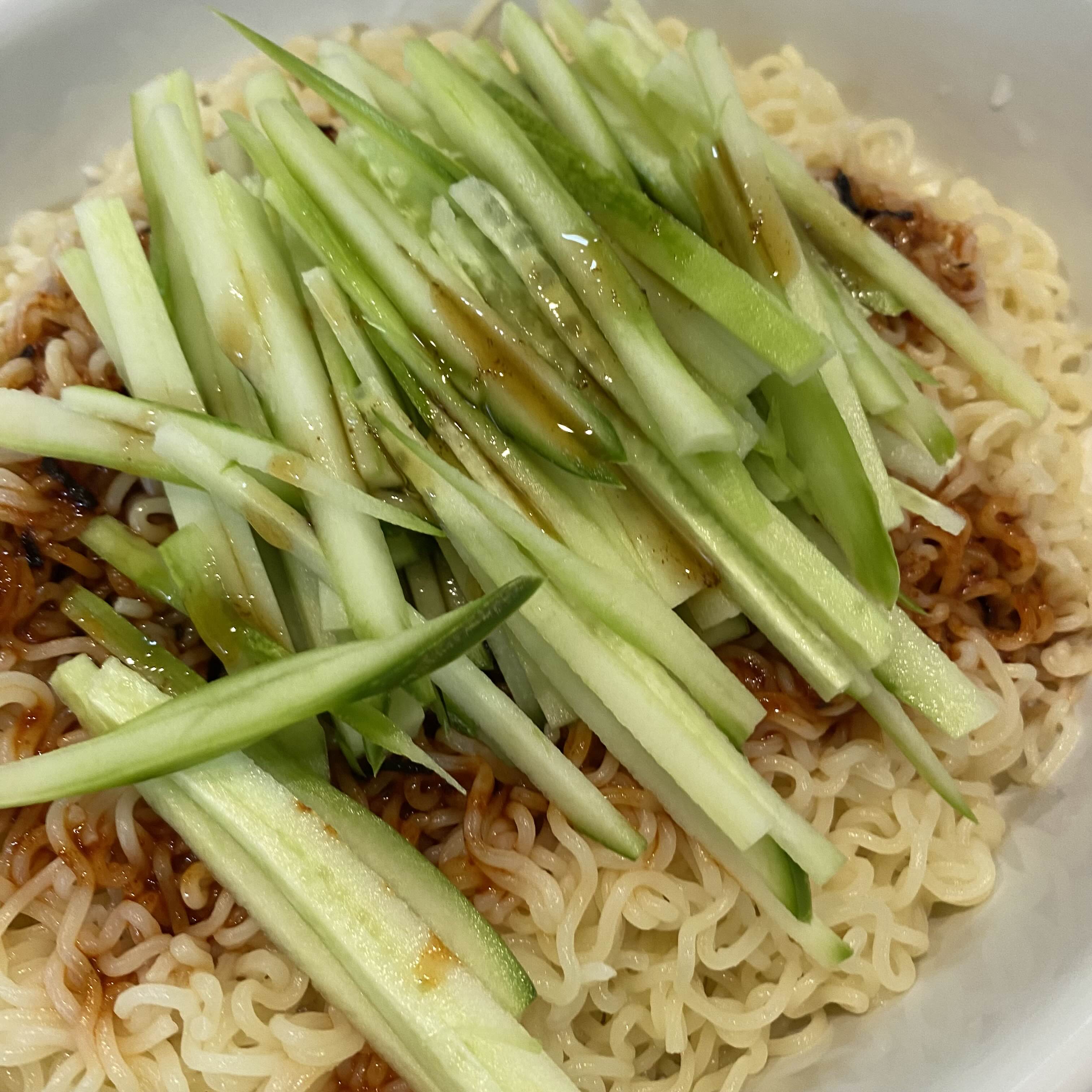 오이 1개 채 썰어 올려 준다음 참기름 한 스푼 올려주었습니다