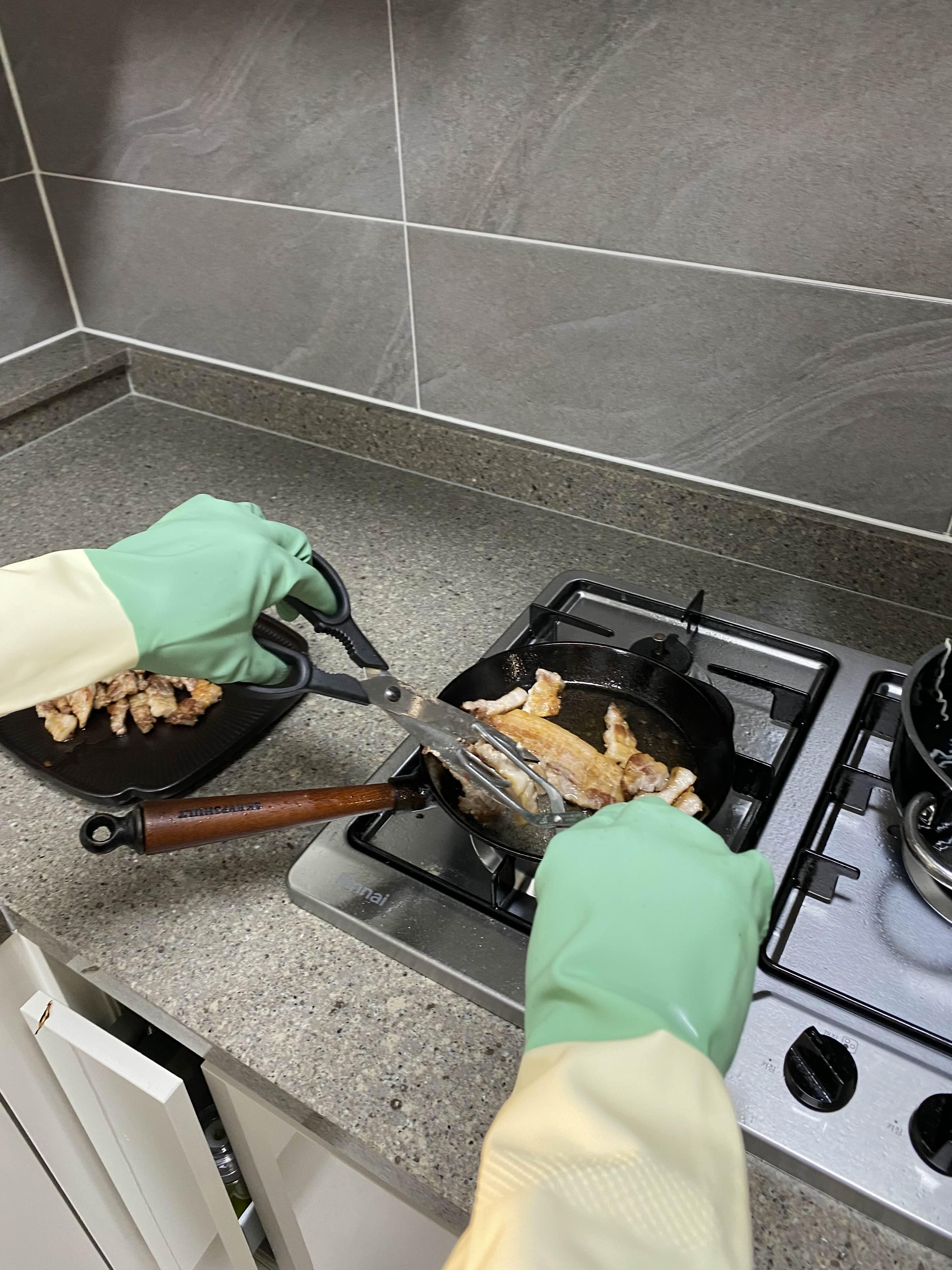 앗 뜨거워 ㅋㅋ 연발인데요 남편이 특단의 조치로 고무장갑을 끼고 굽는 상태까지 이르렀습니다